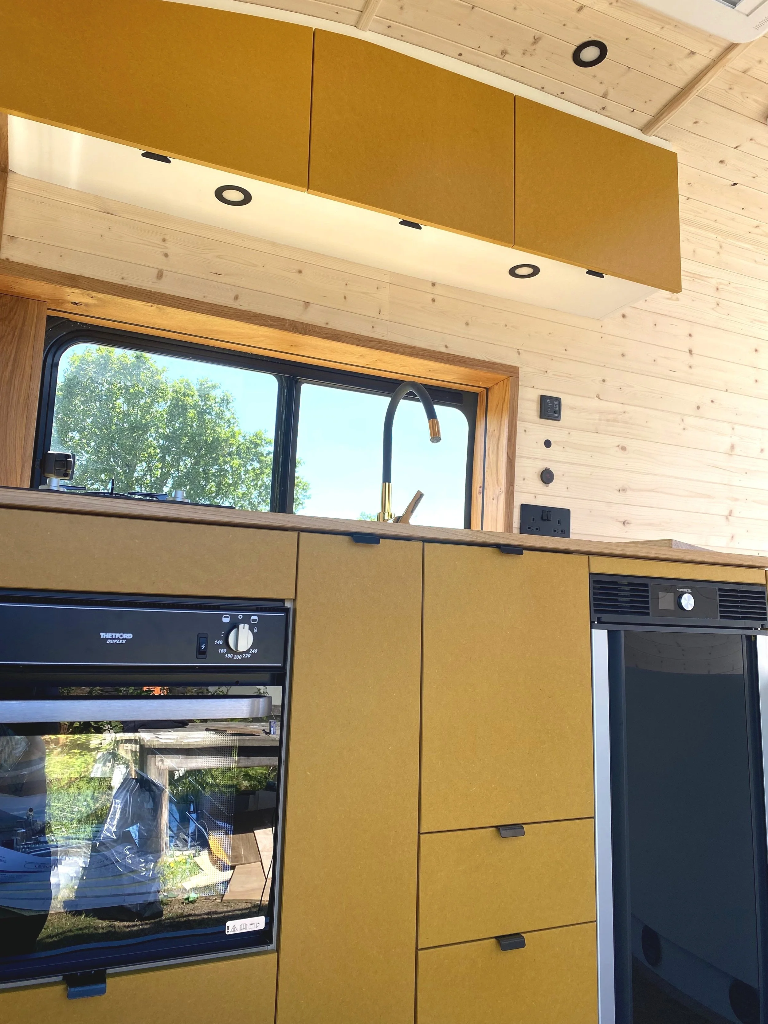 A unique mustard Velcromat kitchen with a jointed worktop made of locally grown Chestnut. We kept the weight of the carcassing down by using Lightweight Poplar Ply, and used RV Lab Handles for ease of functionality.